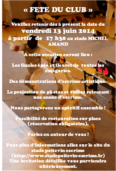 La traditionelle fête du club se tiendra le Vendredi 13 Juin 2014 à la salle d'arme à partir de 17h30.