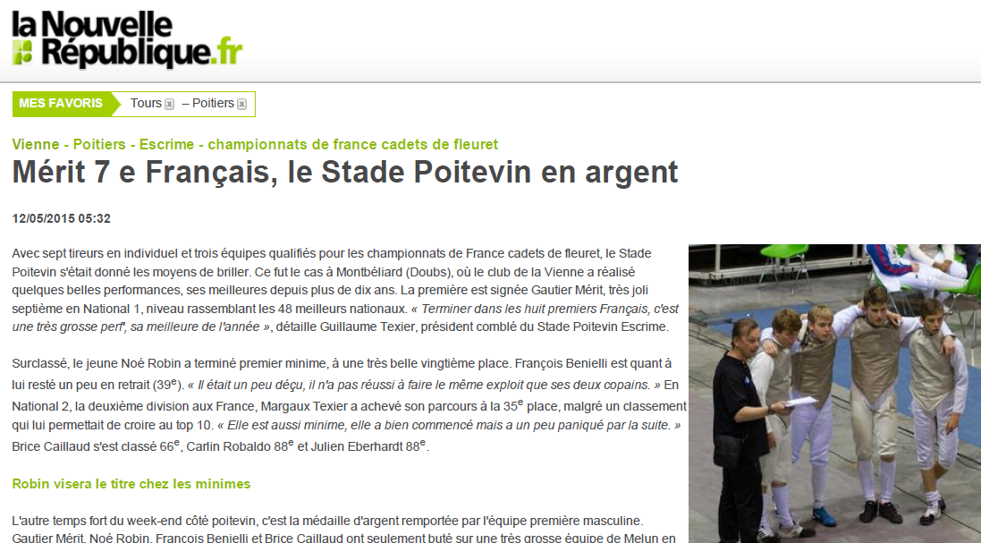 Mérit 7 e Français, le Stade Poitevin en argentMis à jour : mardi 23 février 2016 14:02 Stade Poitevin Escrime - Poitiers Précédent Suivant Tweeter Share Share powered by social2s